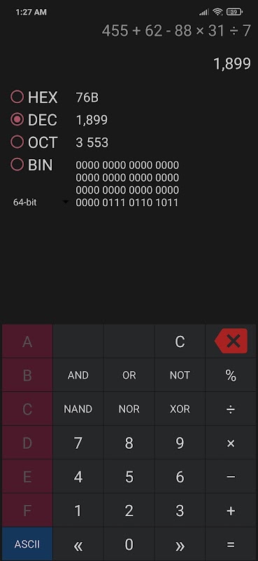 ماشین حسابی که از هگزادسیمال، باینری، اکتال، اعشاری و اسکی پشتیبانی می کند.