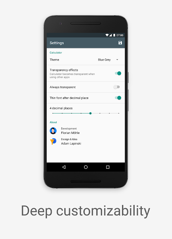 باز کردن تنظیمات به شما می دهد گزینه ای را برای بین یکی از چهار تم ها، گزینه ای برای افکت های شفاف و همچنین سایر تنظیمات مختلف را انتخاب نمایید. همچنین یک دکمه برای راه اندازی دستگاه شما ساخته شده در ماشین حساب اگر شما نیاز به حل محاسبات پیشرفته تر است.