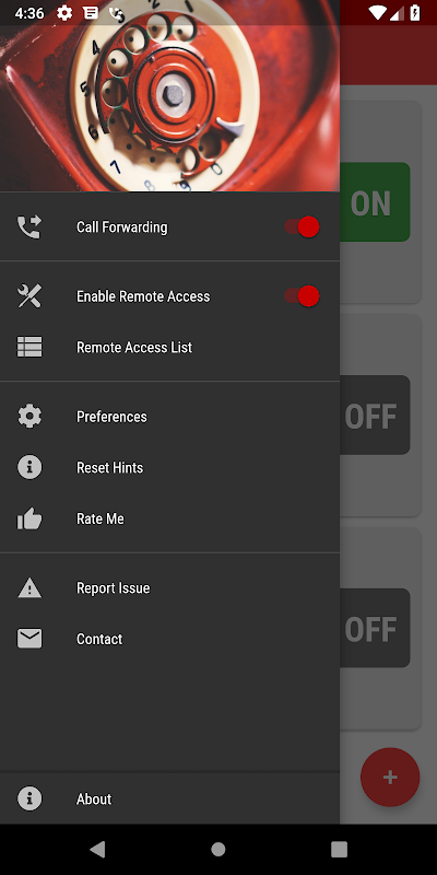 NOTE3: Application require SEND/SMS permssion to communicate with your remote phone via SMS messages (to enable/disable call forwarding).