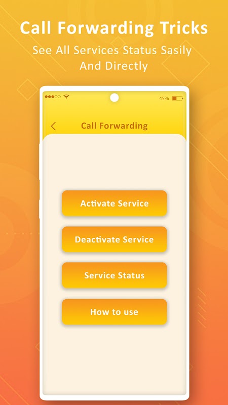 ** Note: The call forwarding status is achieved by catching you outgoing calls as android does not provide a way to check the call forwarding status on your phone. It may not be accurate if you have activate / deactivate call forwarding on another phone.**