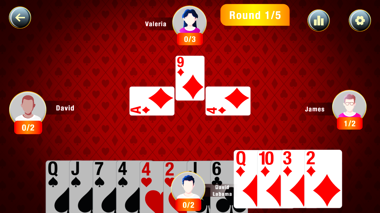 حریفان هوش مصنوعی در Callbreak چالش برانگیز هستند و شما را سرپا نگه می دارند. شما باید از بهترین تاکتیک ها و استراتژی خود برای پیشی گرفتن از آنها و بردن بازی استفاده کنید. با هر برد، امتیازهایی به دست می آورید که به شما کمک می کند تا از جدول امتیازات بالا بروید و قهرمان نهایی Callbreak شوید.