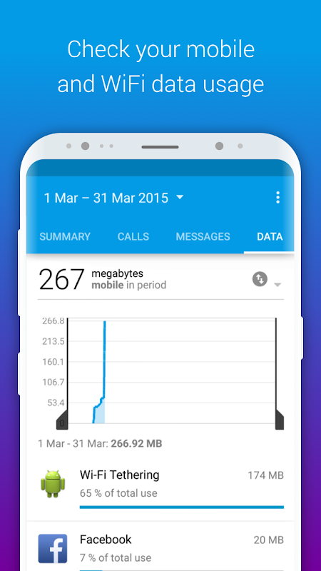 📈 Comprehensive views: Information about mobile data usage are visualized on calls, messages and data usage charts,