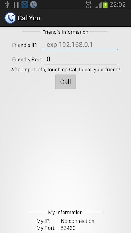 To call or chat with your friend, simple enter your friend device's IP and Port and wait for your friend accept your connection then all of you can talk and chat free.