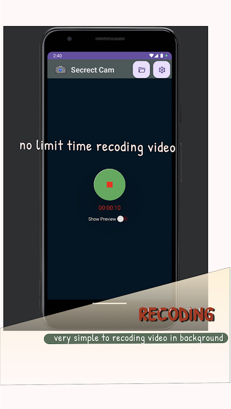 Camera Overlay Secret یک دوربین برنامه است که به طور معمول به شما کمک می کند ویدیو را در پیش نمایش دوربین پس زمینه ضبط کنید. با بسیاری از عملکردهای مفید مانند ادامه ضبط در هنگام خاموش بودن صفحه یا برنامه ریزی برای ضبط. استفاده آسان از برنامه با یک کلیک میانبر مخفی Camera Overlay (ضبط سریع).