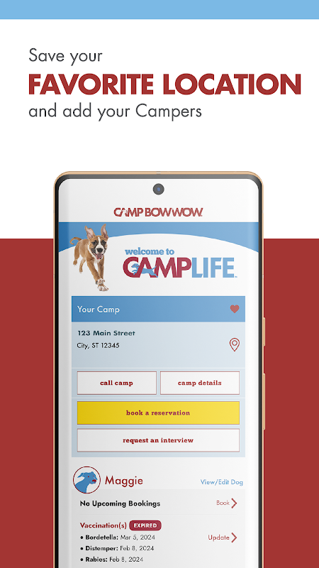 کمپ را در دسترس خود قرار دهید! برنامه Camp Bow Wow® به شما این امکان را می دهد که به راحتی درخواست مراقبت روزانه و رزرو شبانه روزی سگ خود کنید، بازی سگ خود را تماشا کنید و در وب کم های زنده ما معاشرت کنید، دستورالعمل های تغذیه و مراقبت از Camper خود را مدیریت کنید، سوابق واکسیناسیون را آپلود کنید، بسته های مراقبت روزانه را خریداری کنید و موارد دیگر.
