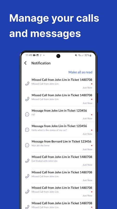 - از طریق برنامه به مشتریان در حال حرکت پیام دهید و تماس بگیرید.
