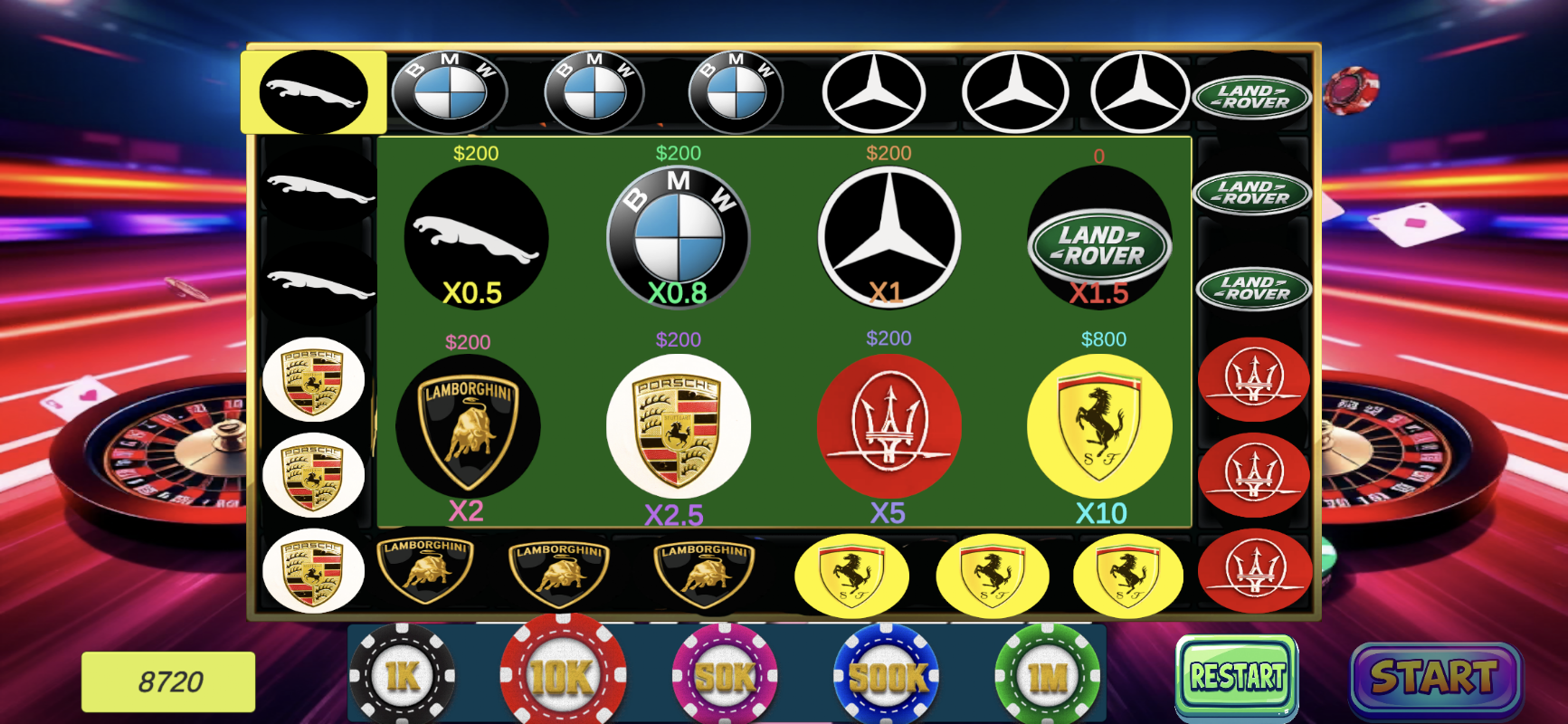 با چرخاندن چرخ رولت به راحتی می توانید انواع مختلف خودرو را انتخاب کنید. طراحی ساده و شهودی شروع کار را برای همه آسان می کند. تراشه های مناسب را انتخاب کنید و روی برند مربوطه شرط بندی کنید. برندهای مختلف مزایای متفاوتی خواهند داشت. بیایید آن را امتحان کنیم.