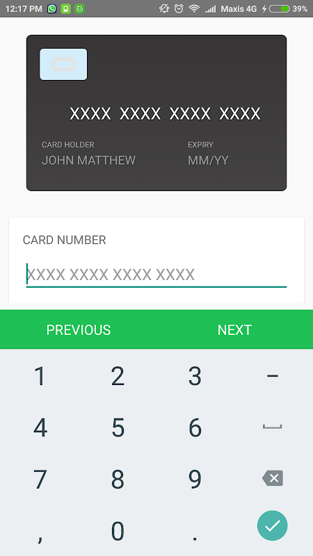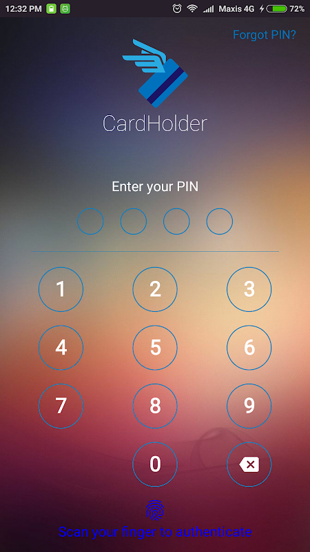 دارنده کارت کمک می کند تا به شما برای ذخیره اطلاعات کارت بدهی / اعتباری خود را با خیال راحت و ایمن است و می تواند به عنوان کپی نرم کارت استفاده می شود. تمام جزئیات به طور کامل به صورت محلی در ذخیره سازی امن ذخیره شده است. دسترسی به این برنامه محدود شده است با استفاده از PIN و اثر انگشت احراز هویت.