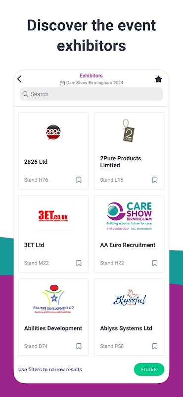 برنامه رسمی برای Care Show Birmingham و Care Show London. همه اطلاعات رویداد را در یک مکان پیدا کنید، از محتوای آموزشی گرفته تا نمایه های غرفه داران و موارد دیگر. با سایر شرکت کنندگان، غرفه داران و سخنرانان ارتباط برقرار کنید. همچنین می توانید به جلسات انتخاب شده از رویدادهای Care Show قبلی دسترسی داشته باشید.