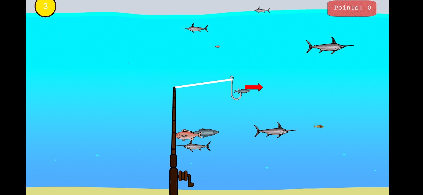 برای شکار ماهی های وحشی که در تانک شنا می کنند، برای بیرون انداختن خطی کلیک کنید.