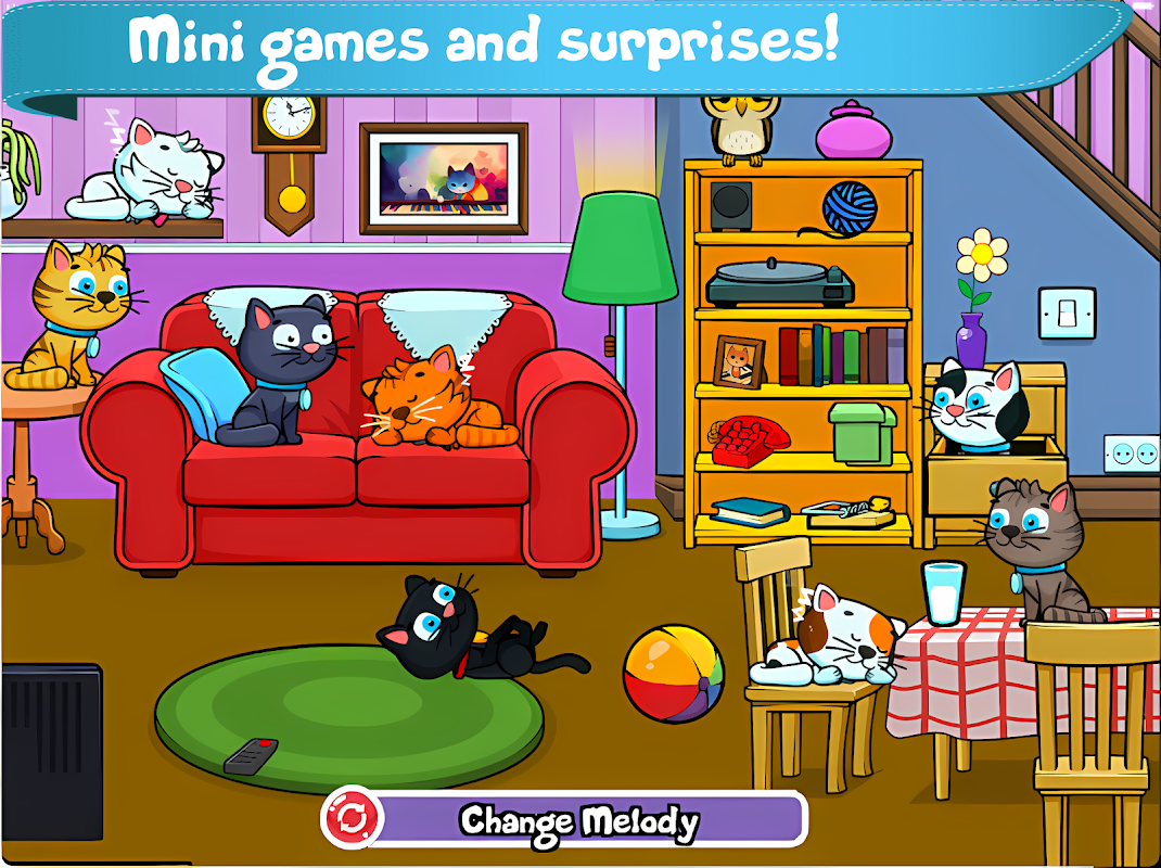 به اتاق گربه خوش آمدید! در این مینی بازی سرگرم کننده و جذاب، کودکان می توانند دنیای موسیقی پر از گربه های ملودیک را کشف کنند. در این اتاق می توانید ملودی را انتخاب کنید و با لمس گربه ها نتی از آن ملودی ساطع می کنند.