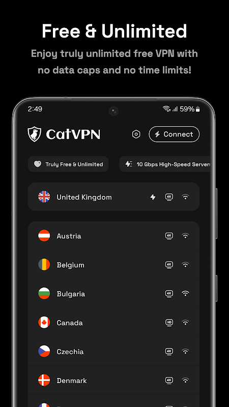 به سادگی برنامه CatVPN را نصب کنید، برای اتصال ضربه بزنید و از تجربه اینترنت ایمن تر لذت ببرید — بدون ثبت نام یا هزینه های پنهان.