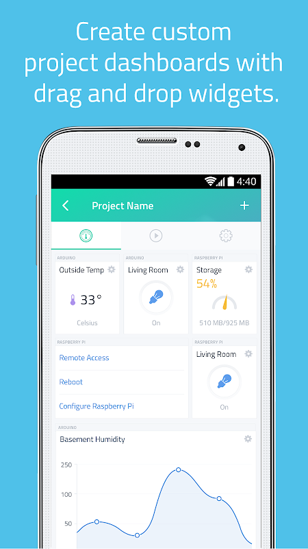 You can add, manage and control sensors and actuators from your phone’s dashboard from a library of drag and drop widgets.