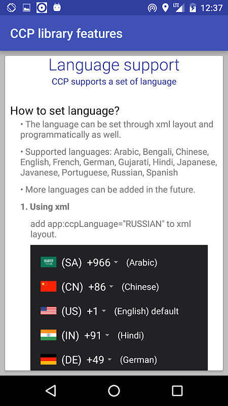 یک برنامه ی نمایشی از کتابخانه کد کشور جمع آندروید.