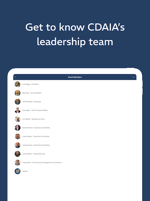 برنامه انجمن بازپرسان دادستان ناحیه کالیفرنیا (CDAIA) به اعضا اجازه می دهد در هر زمان و هر مکان با سازمان خود در ارتباط باشند. این برنامه اطلاعات و خدمات مهمی از جمله رویدادهای آینده، دسترسی به دورههای آموزشی، فرصتهای شغلی، بهروزرسانیهای قانونی، اتصال به وبسایت CDAIA، خبرنامه رپ شیت و موارد دیگر را ارائه میکند!