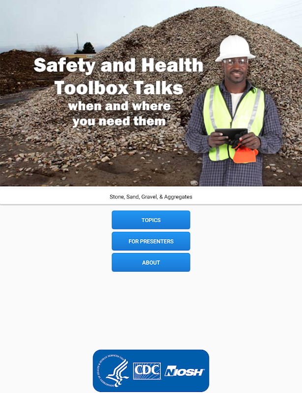 سی دی سی / NIOSH جعبه ابزار مذاکرات طراحی شده برای ارائه اطلاعات مربوط به خطرات محل کار و خطرات به کارگران در سنگ، شن و ماسه، شن، و مصالح (SSGA) عملیات. این اطلاعات می تواند مورد استفاده برای افزایش سلامت و ایمنی کارگران. مصاحبه با کارگران معدن SSGA در مورد حوادث و خطرات در محیط کار وجود خود، و داده های آسیب غیر کشنده و مرگبار در طول سال های 2009-2014 به ایمنی و بهداشت اداره معدن (MSHA) گزارش: این سری از جعبه ابزار مذاکرات با استفاده از داده از دو منبع ایجاد شد. هر جعبه ابزار برای بحث شامل یک نقل قول از یک کارگر معدن برای نشان دادن یک تجربه اول شخص با یک خطر و یا خطر است. این تجربه اول شخص است و سپس به داده آسیب MSHA مرتبط به نشان می دهد که این تجربه سازگار با واقعیت های حوادث، صدمات، و مرگ و میر است. در نهایت، چند سوال را شامل می شوند که می تواند مورد استفاده قرار گیرد برای شروع یک بحث در مورد یک موضوع جعبه ابزار برای بحث خاص - به عنوان مثال، سوالات برای ورقه و سقوط موضوع در داشتن کارگران معدن متمرکز شناسایی که در آن ورقه و سقوط به احتمال زیاد در محل معدن خود رخ می دهد و راه کارگرند تواند خود را از لغزش و سقوط صدمات محافظت می کند. در مجموع 13 مذاکرات موجود در این سری وجود دارد.