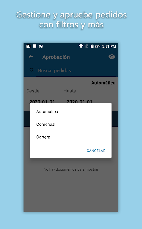 CEDI برنامه ای برای مدیریت و خودکار کردن حالت های تصویب ، ثبت نام سفارشات فروش در یک شرکت است. این برنامه به شما امکان می دهد تا ماژول های تصویب تجاری ، نمونه کارها ، کنترل ثبت نام ، انتخاب و ثبت نام در بسته بندی و تأیید ثبت نام برای یک توزیع سریعتر و کارآمد تر را با استفاده از کاغذ داشته باشید.