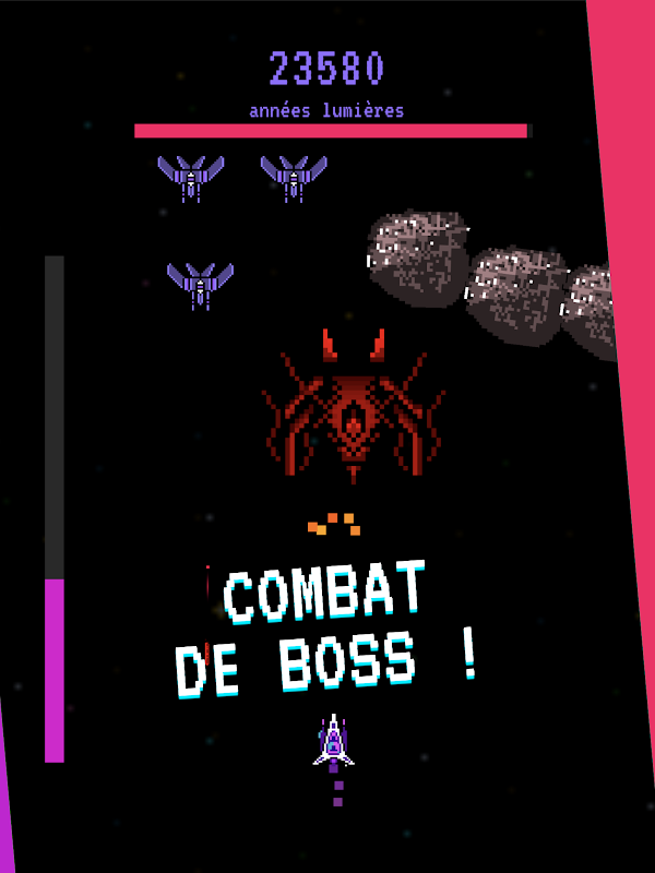 - Combattez les boss et éviter les pluies d'astéroïdes.