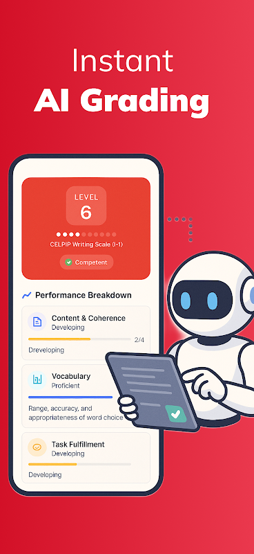 نمرهدهی و بازخورد فوری هوش مصنوعی: نمرهدهی فوری و دقیق برای نوشتن و صحبت کردن دریافت کنید و عملکرد خود را برای شناسایی نقاط قوت و ضعف پیگیری کنید.