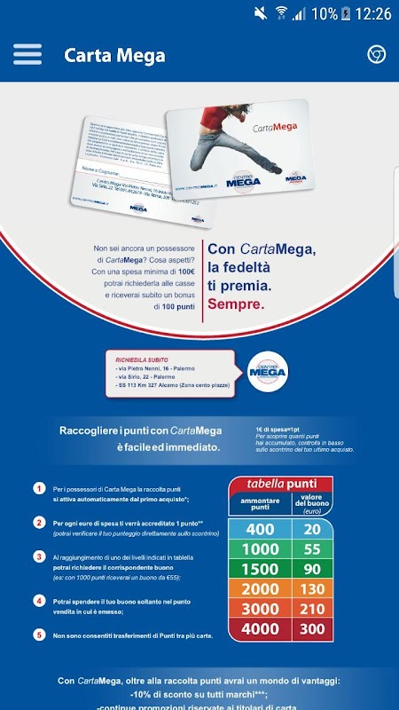 مرکز مگا، سیسیلی رهبر شرکت در بازاریابی کفش و لباس، در حال حاضر در دسترس گوشی های هوشمند خود: این برنامه ارائه می دهد یک راه جدید برای کشف بسیاری از محصولات در فروشگاه ما، بیش از 100 مارک که شما در فروشگاه ما پیدا کنید، همه آخرین تبلیغات در تنها چند کلیک قابل دسترسی، و خیلی بیشتر.