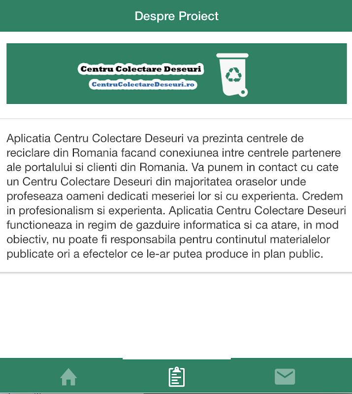 نرم افزار جمع آوری زباله مرکز ارائه مراکز بازیافت در رومانی ساخت ارتباط بین مراکز پورتال شریک و مشتری در رومانی. ما در تماس با مرکز جمع آوری یک زباله در بسیاری از شهرستانها که در آن مردم اختصاص داده شده تمرین مهارت های و تجربه خود را.