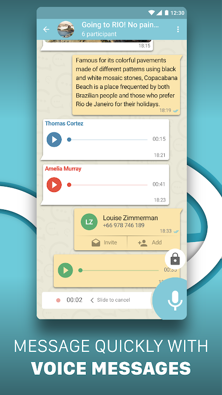 رایگان: بدون هزینه اشتراک، بدون افزودن و همیشه رایگان. شما می توانید هر زمان که دوست دارید و هر کجا که هستید به صورت رایگان پیام ارسال کنید. دوستان خود را که در سراسر جهان هستند بدون هیچ هزینه پیامک بین المللی چت کنید.(*)