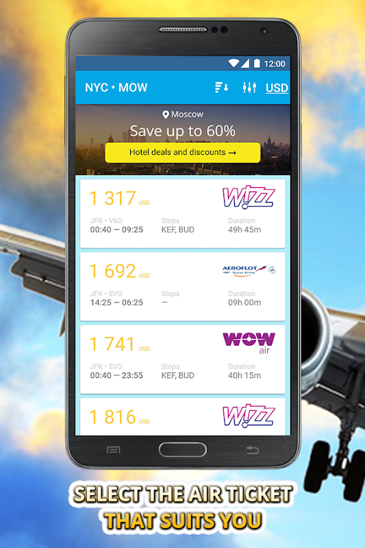 با استفاده از این برنامه شما قادر خواهید بود خرید بلیط ارزان آنلاین از بیش از 30 حامل. این شرکت در یک مکان از شرکت های برجسته مانند امارات، هواپیمایی سنگاپور، نپتون، ترکیه، قنتا، گارودا اندونزی، تایلندی ایرلاینز، سوئیس بین المللی، ایرلند نیوزیلند، خطوط هوایی اتریش، جنوب غربی، و همچنین از نروژ، EasyJet، Asul، Cebu Pacific جمع آوری شده است. در صورت تمایل، می توانید نتایج جستجو را توسط شرکت هواپیمایی یا آژانس که بلیط ها را می فروشند مرتب کنید.