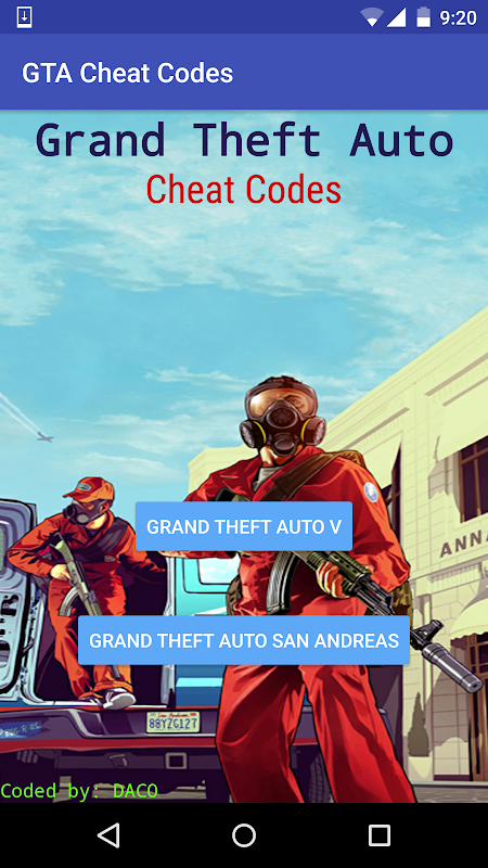 App for Cheat Codes for Grand Theft Auto V, and Grant Theft Auto San Andreas.