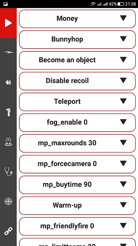 •BIND •SPAWN BOMB •BOT_MIMIC •FIRST-AID KIT •ENDLESS WARM-UP •BUNNYHOP •CROSSHAIR SETTINGS •HEAVY ARMOR •TRANSFORMATION INTO AN OBJECT