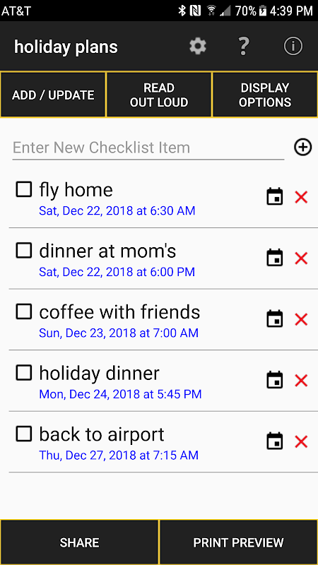 برنامه چک لیست آن برای ایجاد لیست های خرید مواد غذایی، لیست های سفر / تعطیلات، چک لیست حرکتی، چک لیست های کمپینگ / کوله پشتی، چک لیست های نگهداری از خانه و هر چیز دیگری که لازم است لیست کنید و چک کنید.