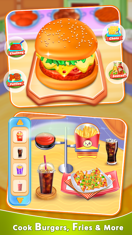 در یک شبیهساز آشپزی رستوران سرگرمکننده، برگرها، پیتزا، سیبزمینی سرخکرده و دسرها را بپزید.