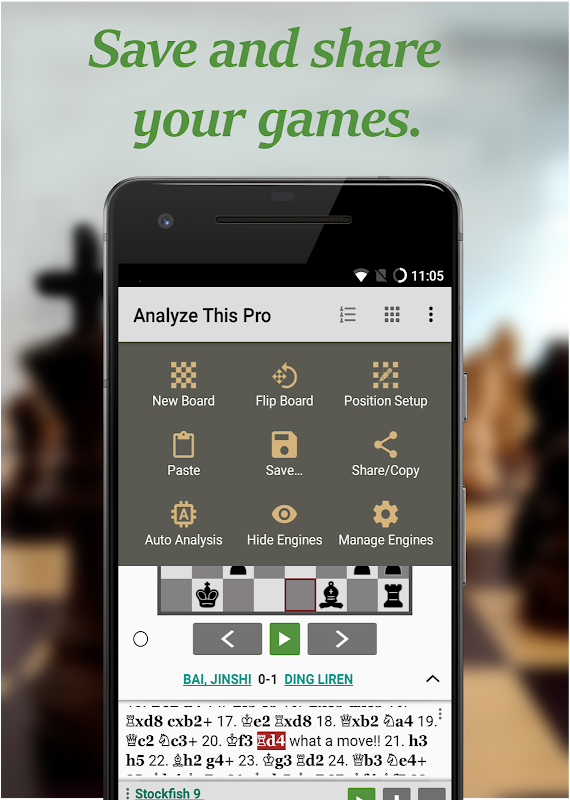 Analyze your games with the latest Chess AI. Save or load games. Share & do more