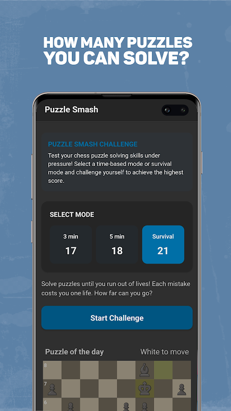تاکتیکهای شطرنج خود را از طریق یک چالش خلاقانه به سبک بلیتز که ترکیبی از شدت بازی Puzzle Rush با دقت آموزش تاکتیکی است، کامل کنید. هر جلسه پازلهای سختتری را به شما ارائه میدهد که تواناییهای تشخیص الگو و محاسبه شما را تحت فشار زمان آزمایش میکند.