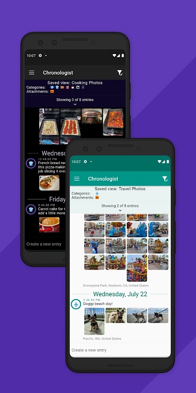 Chronologist keeps your own personal timeline of entries, each of which can have text, location, photos, and categories. You can quickly search your entries, and save these views for quick access.