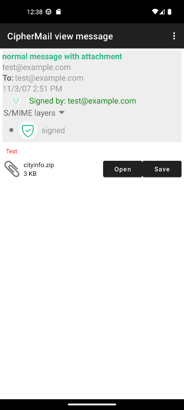 - CipherMail برای Android عملکردی برای بازیابی ایمیل ارائه نمی دهد. برای بازیابی پیام رمزگذاری شده smime.p7m پیوست شده، باید از یک برنامه ایمیل موجود Android، به عنوان مثال Gmail، K9 یا سرویس گیرنده ایمیل پیش فرض Android استفاده شود.