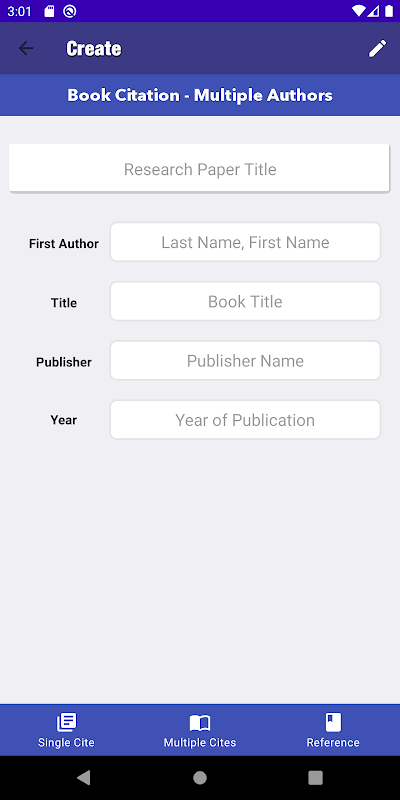 Cited is the easiest citation creation app. Simply select your paper format and your template, enter the information, and press create. Now with a section to create and save multiple citations.