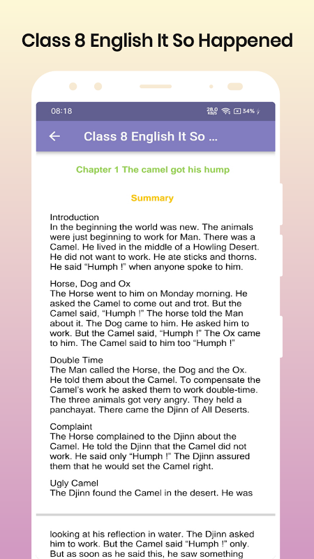 این برنامه شامل سوالات پاسخ به تمام فصل های موجود در CBSE کلاس 8 NCERT انگلیسی است.