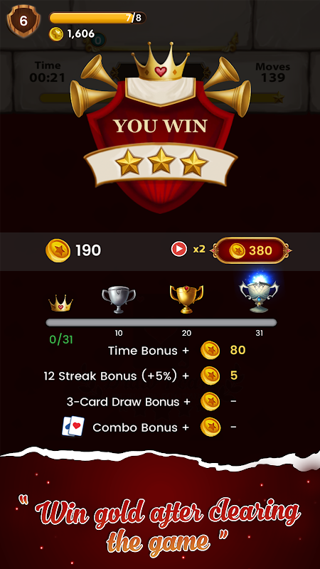 ♥ همچنین می توانید با حالت بازی Arcade Solitaire با چالش روبرو شوید و از Draw Draw 1 آسان بروید تا Draw 2 یا 3 بازی به سطح شما بستگی داشته باشد (از سطح پایین تا بالا).