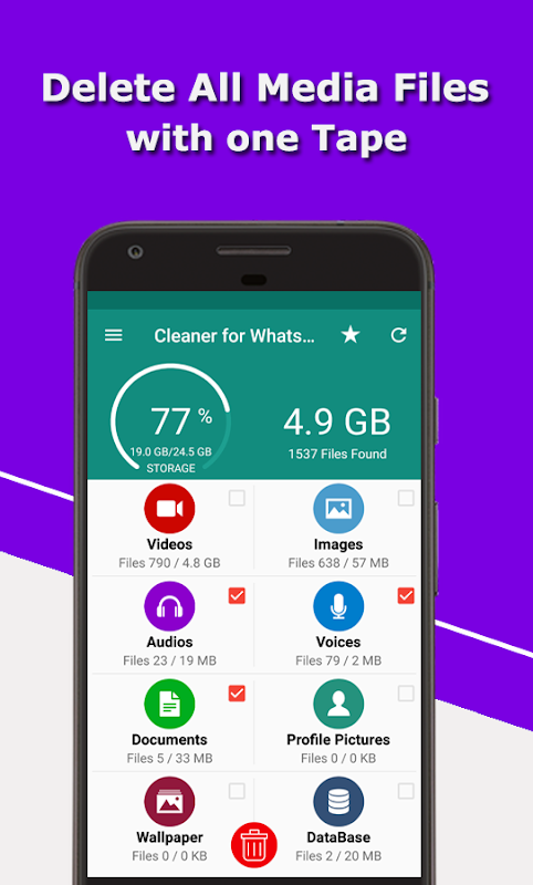 cleaner whatsapp helpe you to manage received and sent videos, images, audios ,voice notes, allpaper, Profile Picture & Databases of watsap folder, you can clear or share media files using whatsapp cleaner, storage cleaner provide delete mutiple files feature with one tap or you can delete all files folders on just one click.