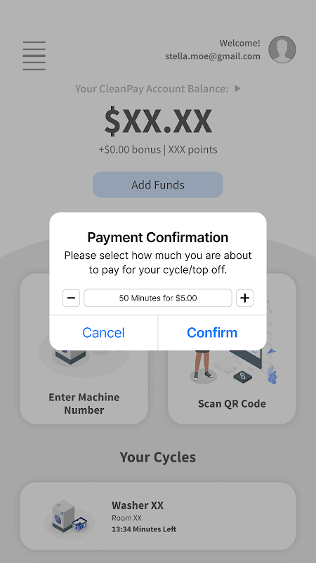 • بررسی تعادل کارت / حساب خود، و افزودن ارزش به حساب کاربری خود را برای لباس های شسته.