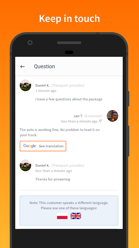 برنامه تلفن همراه برای ارائه دهندگان حمل و نقل تأیید شده توسط Clicktrans در دسترس است. با تشکر از برنامه شما همیشه لیست های جدید را در دست خواهید داشت!