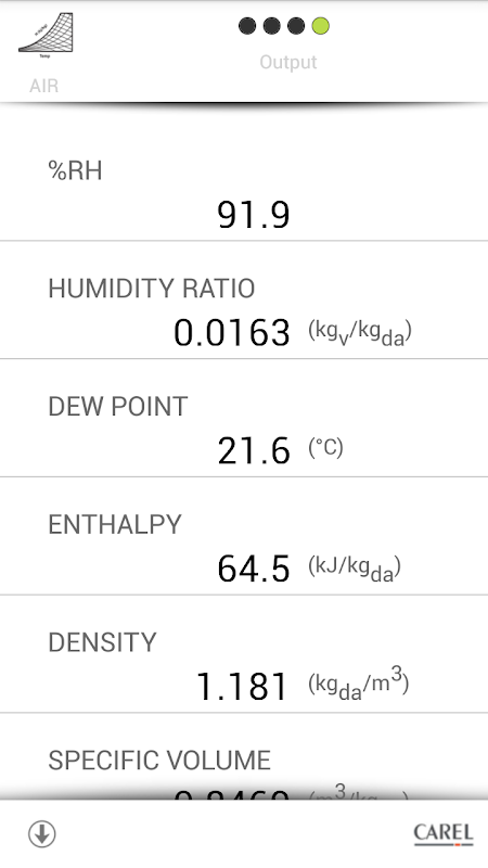 · AIR calculates the characteristic parameters of the air by entering 2 of the following 4 values: dry-bulb temperature (DBT), wet-bulb temperature (WBT), %rh, humidity ratio. The outputs are: dew-point temperature, specific enthalpy, density, specific volume, vapor pressure, vapor density