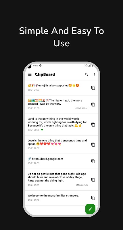 با Clipboard، هر بار که یک قطعه متن را کپی می کنید، به طور خودکار به لیست جامع و همیشه در حال رشد شما اضافه می شود. این را تصور کنید: شما در حال کار بر روی یک پروژه هستید و اغلب نیاز به استفاده از عبارات خاص، پاسخ های ایمیل یا حتی کدهای تبلیغاتی بازی دارید. تنها با یک کپی ساده، کلیپ بورد تضمین می کند که تمام قطعات پرکاربرد شما به راحتی در دسترس شما هستند.