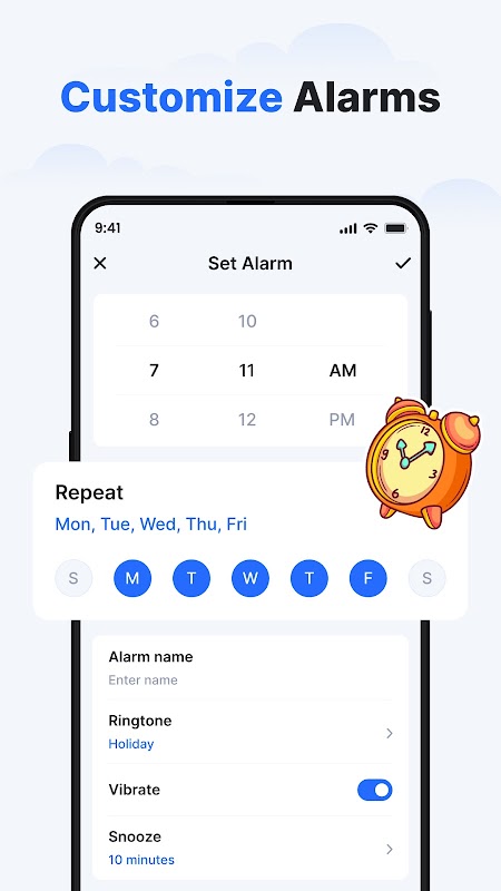ویژگی ساعت زنگ دار هوشمند قابلیت اطمینان و راحتی را تضمین می کند و آن را به یک ساعت زنگ دار «باید» برای من و شما تبدیل می کند. ساعت زنگ دار صمیمی ترین دستیار زندگی شماست. می توانید ظاهر ساعت را با تم های ساعت فراوان انتخاب کنید! این به شما کمک می کند تا آرامش داشته باشید و در لحظه مناسب از همه رویدادهای مهم مطلع شوید.