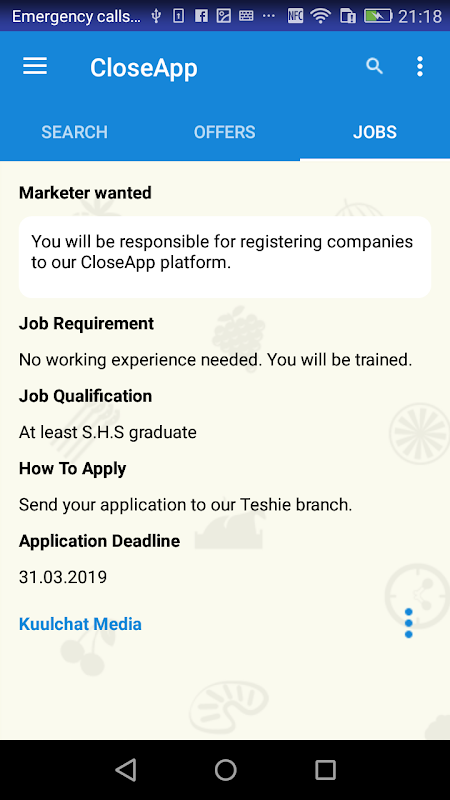 CloseApp is an app for searching services, businesses, jobs, offers (Sell Products or Give Off Discounts) and Jobs.