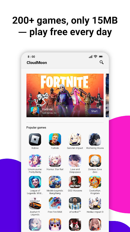 ・CloudMoon راه حل بازی های ابری تلفن همراه شما است—یک سرویس پخش بازی که به شما امکان می دهد بازی های آنلاین را بدون دانلود انجام دهید. صدها بازی را روی تلفنهای با مشخصات پایین مانند Genshin Impact، Roblox، Wuthering Waves، Honkai: Star Rail، Fortnite، Love and Deepspace، CookieRun و Mobile Legends تجربه کنید که همگی مستقیماً در دستگاه شما پخش میشوند.