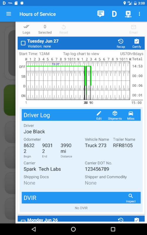 Track driving and vehicle inspection logs in compliance with FMCSA 2017 ELD Rule