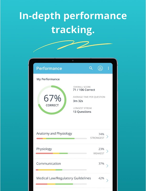 با استفاده از آمادگی برای آزمون کمک پزشکی ما، می توانید سرعت خود را تنظیم کنید و در هر زمان برای گواهینامه AAMA CMA مطالعه کنید! بازخورد فوری دریافت کنید و برای آزمون دستیار پزشکی واقعی CMA آماده باشید. در میان بسیاری از ویژگی های منحصر به فرد، برنامه تسلط AAMA CMA به شما امکان می دهد مناطق ضعیف خود را بهبود بخشید و اعتماد به نفس مورد نیاز برای یک آزمون واقعی را بدست آورید. راهنمای مطالعه دستیار پزشکی شماره 1 در بازار! بدون استرس گواهینامه CMA را دریافت کنید!