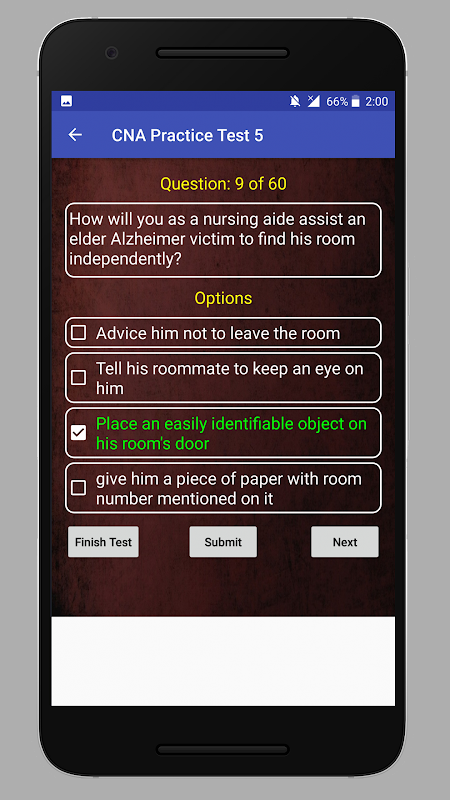 برنامه CNA Practice Test یک برنامه مرتبا و مسابقه رایگان است که خود را برای یک آزمون صدور گواهینامه CNA آماده کنید. این شامل سوالات از آزمون واقعی CNA است که در سالهای 2015 ، 2016 ، 2017 ، 2018 ، 2019 و 2020 برگزار شده است. یک دستیار معتبر پرستاری (CNA) شخصی است که عضو تیم مراقبت های بهداشتی می باشد. وی تحت نظارت یک پرستار ثبت نام شده (RN) یا یک پرستار دارای مجوز (LPN) فعالیت می کند. اصطلاحات متفاوتی برای CNA استفاده می شود. برخی از آنها دستیار پرستاری (NA) ، یک دستیار مراقبت از بیمار (PCA) یا یک کمک پرستار آزمایش شده ای از دولت (STNA) هستند.