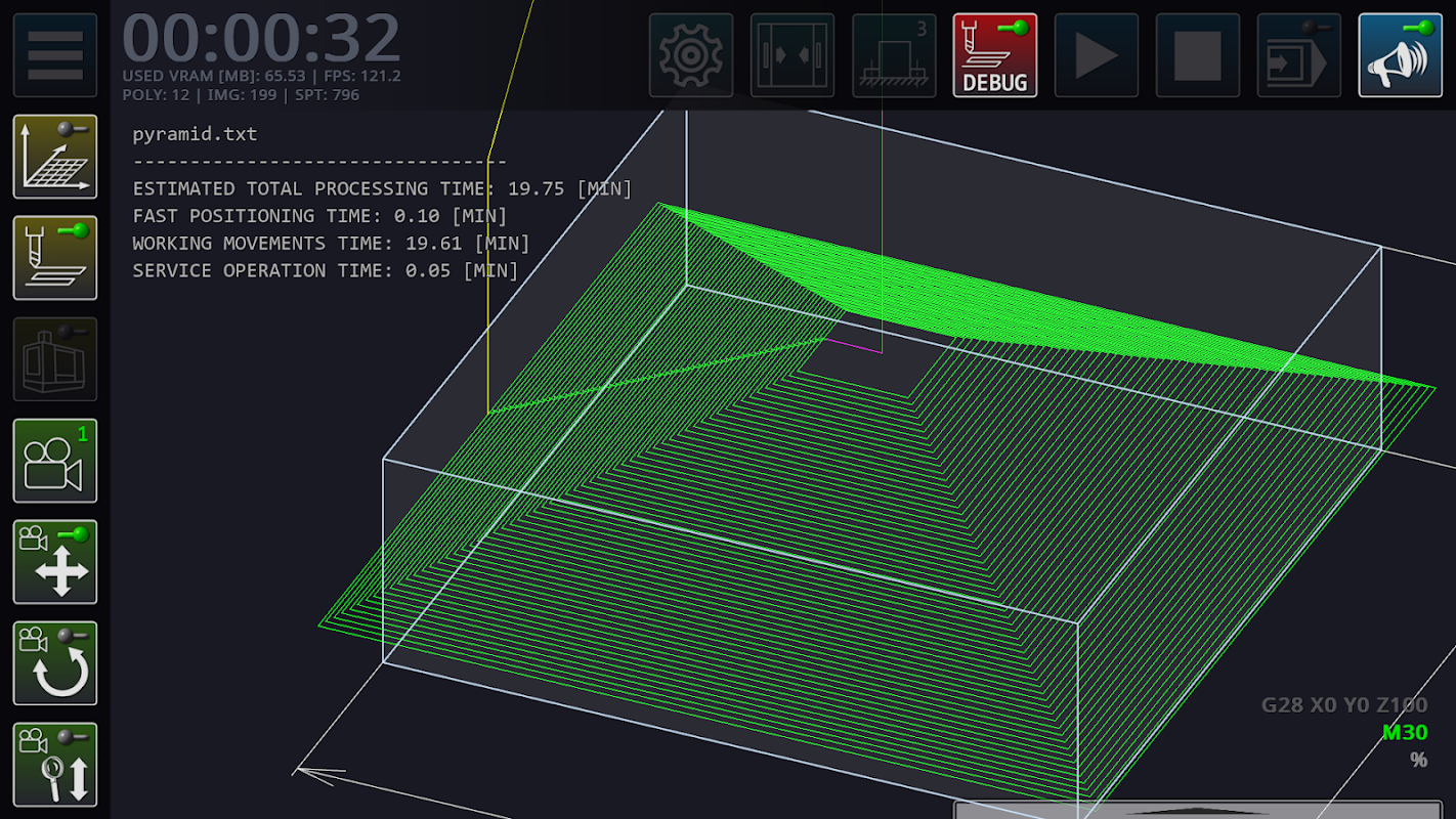 کارکردهای اصلی برنامه: ویرایش کد برنامه های کنترلی دستگاه فرز، عملیات با فایل های برنامه های کنترل، تنظیم پارامترهای هندسی ابزار برش، اجرای پیوسته/گام به گام بلوک های برنامه های کنترلی، سه. -تجسم بعدی حرکات ابزار در فضای کار ماشین، تجسم ساده شده سطح ماشینکاری شده قطعه، محاسبه حالت های پردازش، راهنمای مرجع سریع استفاده از کد G.